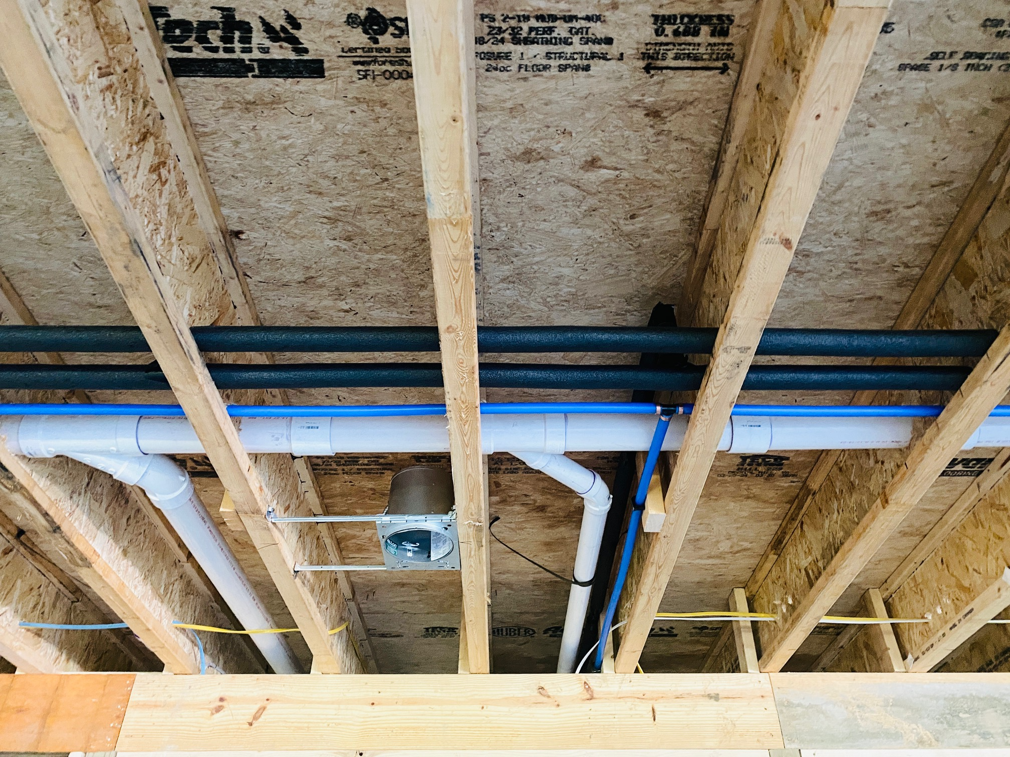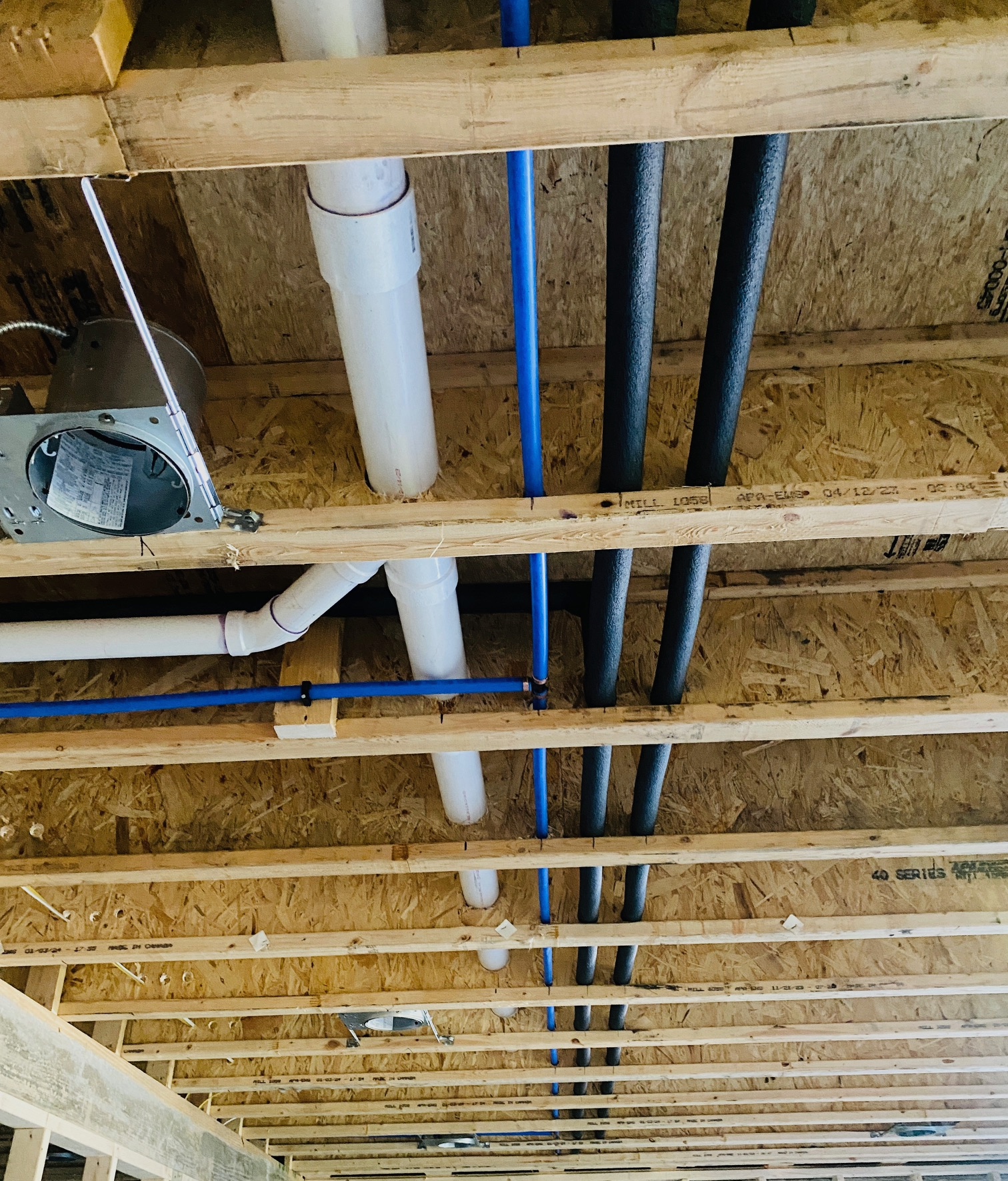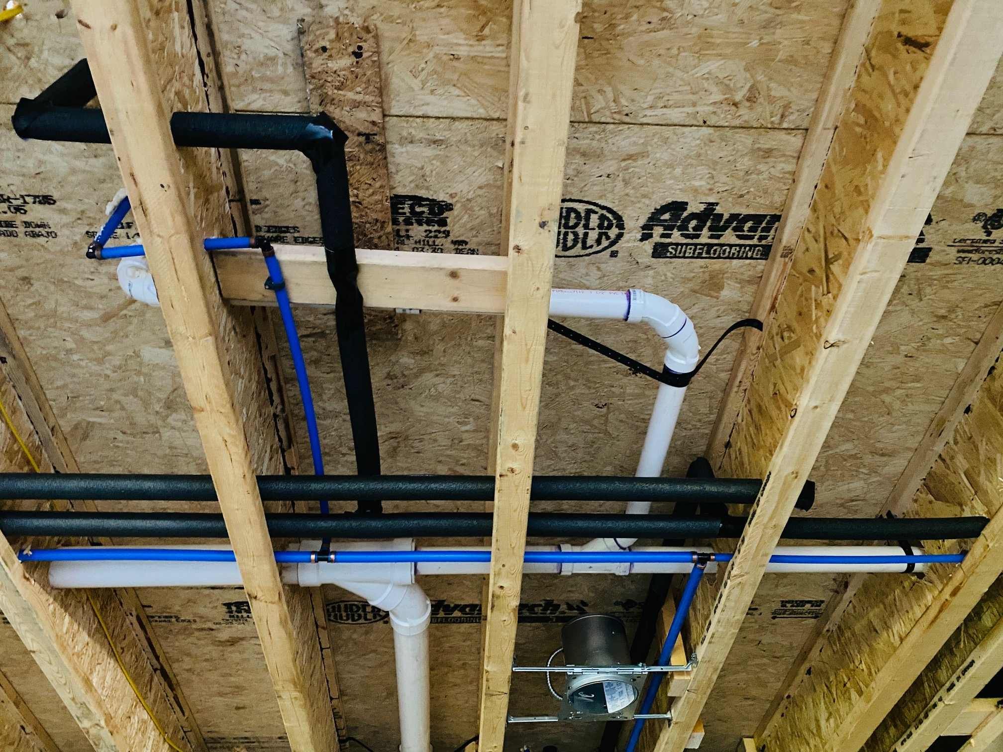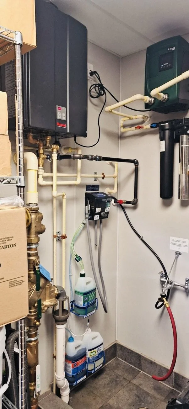 A lot going on in small spaces. ABOVE: water well pressure tank, filtration, softener, carbon block filtration, UV light, and multiple water heater set up. LEFT: Vertical back flow preventer and main shut off, DAB booster pump, Rinnai tankless water heater with water and gas connections, and custom floor sink. Each project had very specific water quality, pressure and flow rates the needed to be met for the equipment to work as it should and Shen-Valley Plumbing delivered.