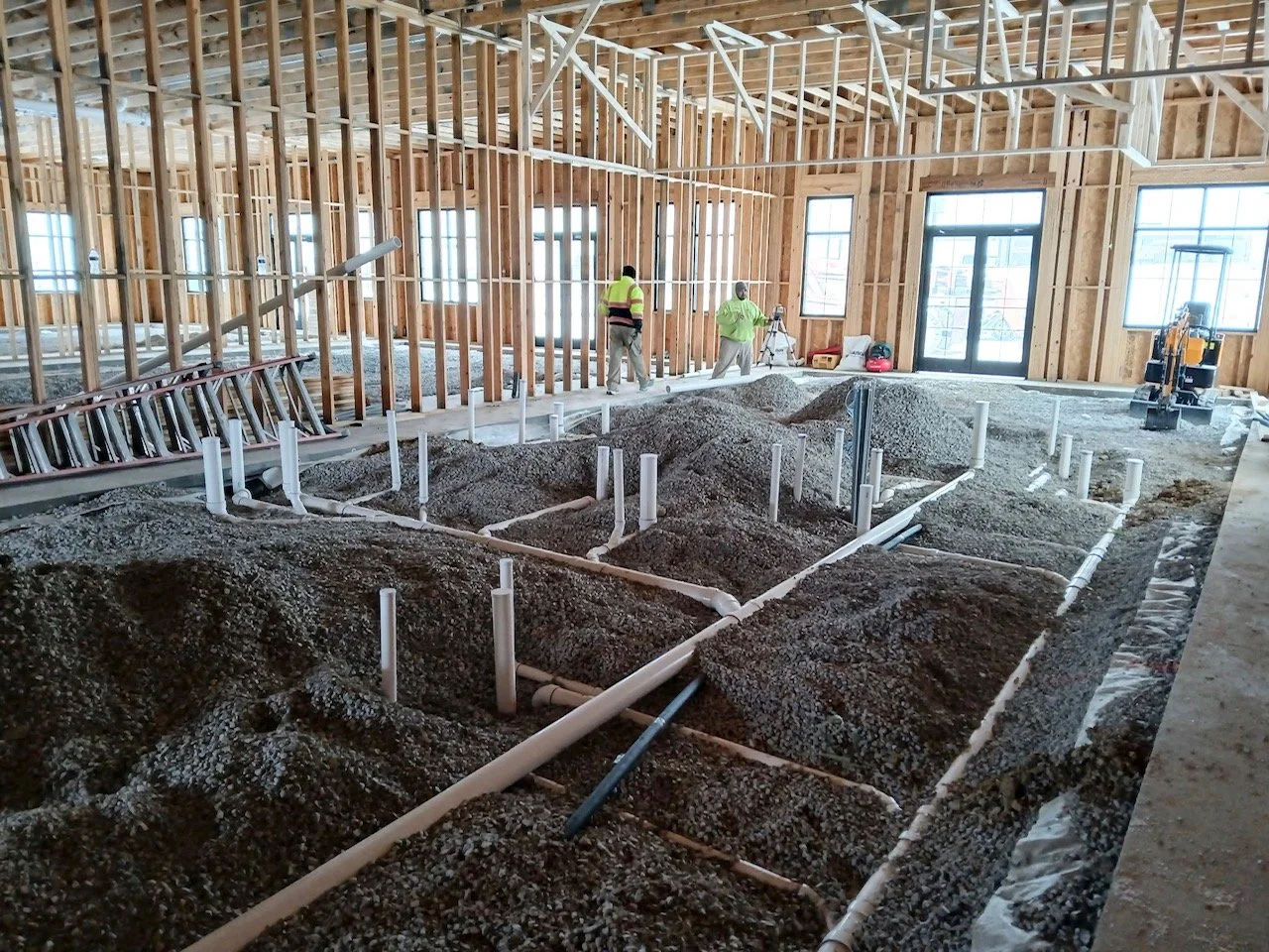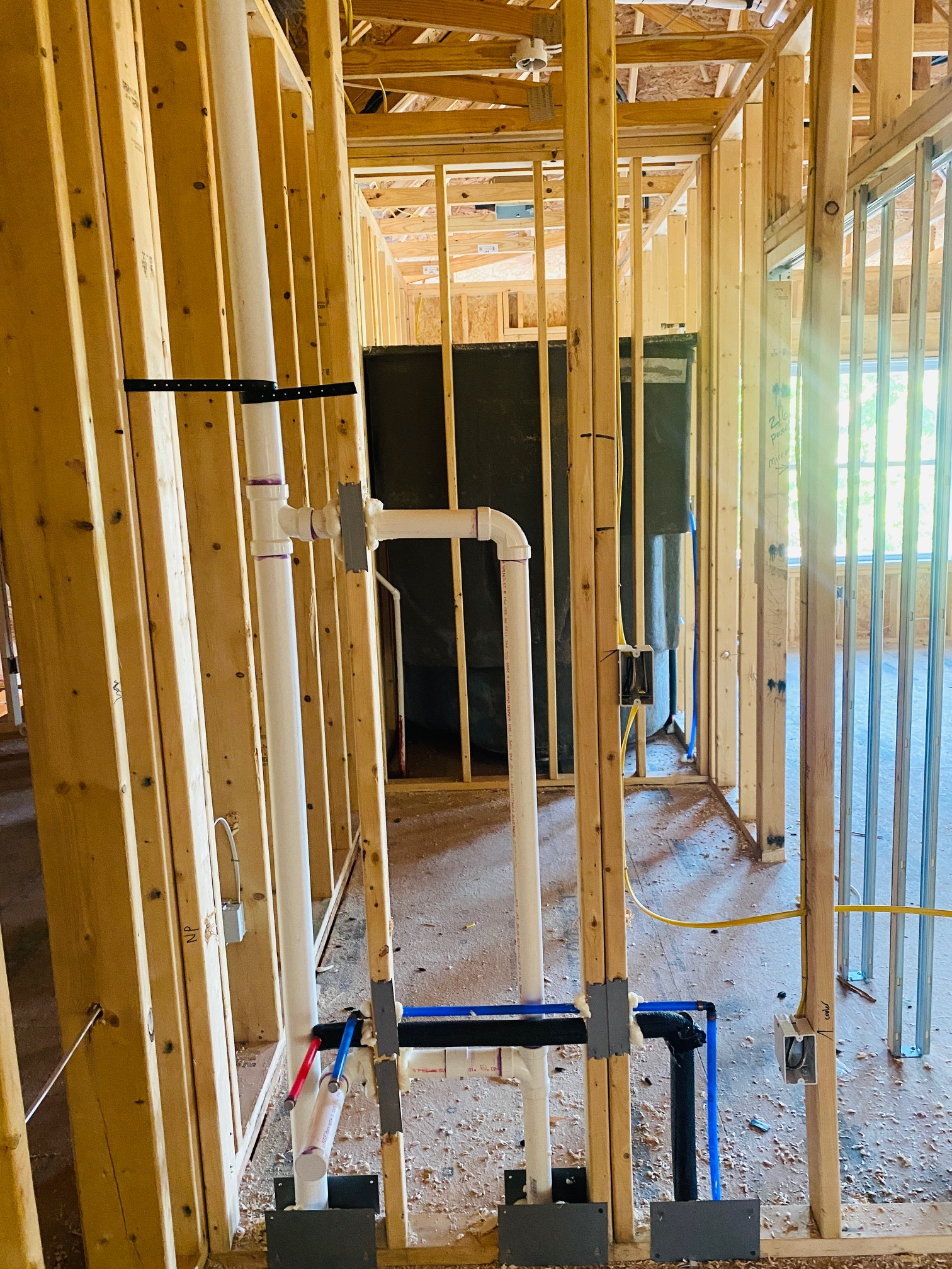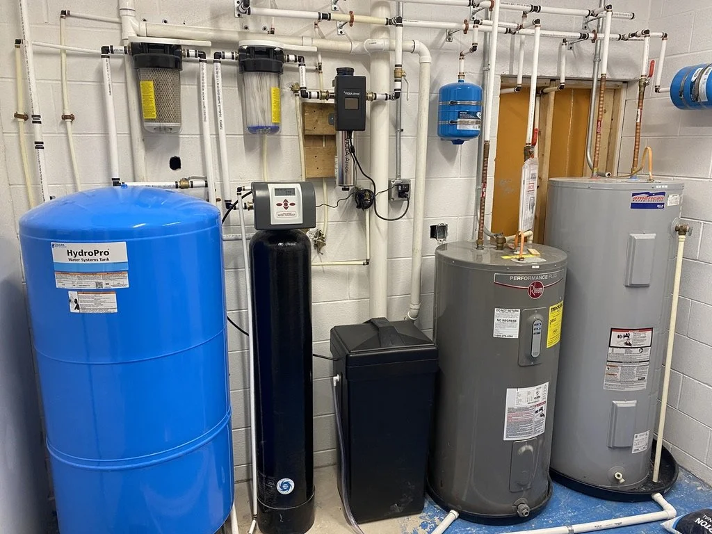 A lot going on in small spaces. ABOVE: water well pressure tank, filtration, softener, carbon block filtration, UV light, and multiple water heater set up. LEFT: Vertical back flow preventer and main shut off, DAB booster pump, Rinnai tankless water heater with water and gas connections, and custom floor sink. Each project had very specific water quality, pressure and flow rates the needed to be met for the equipment to work as it should and Shen-Valley Plumbing delivered.
